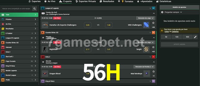 O 56H oferece uma grande seleção de opções de apostas em e-sports com probabilidades competitivas
